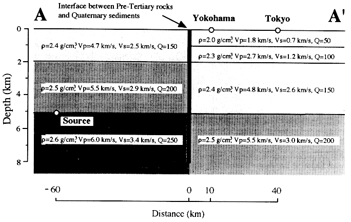 FIG.5. Cross sections of (a) 3-D model 1 and (b) 3-D model 2 along A-A' lines. Bold lines indicate the area of boundary elements.