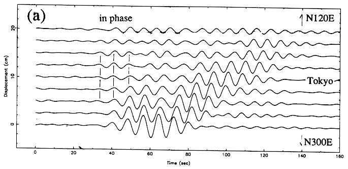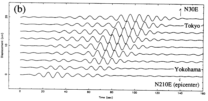 FIG.9. Displacements of N-S component along the lines (a) N120E and (b) N30E, centered at the Tokyo station at intervals of 5km. 3-D model 2 is used.
