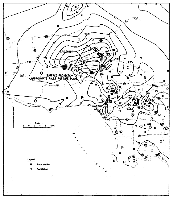 図1:ノースリッジ地震の震源位置(斜線部)と最大水平加速度分布