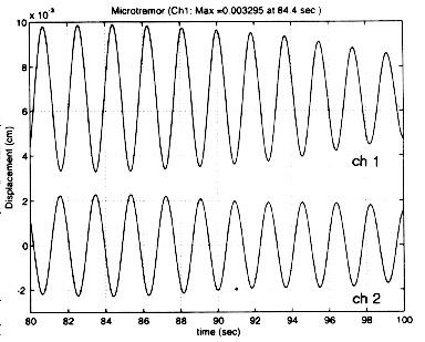 図4:ねじれ1次モード(1.85秒)に狭帯域フィルターをかけたch1とch2の変位波形