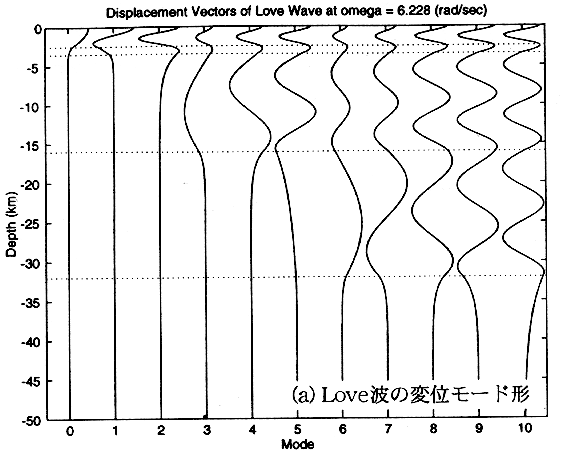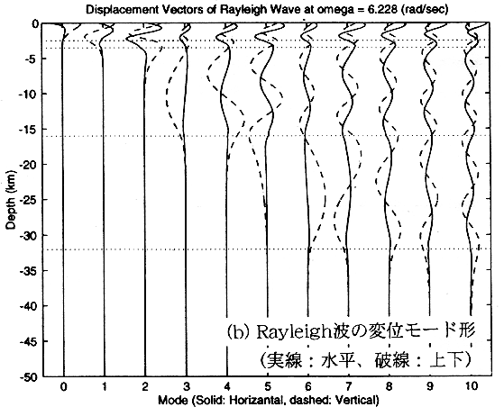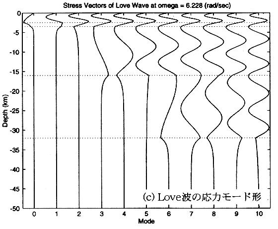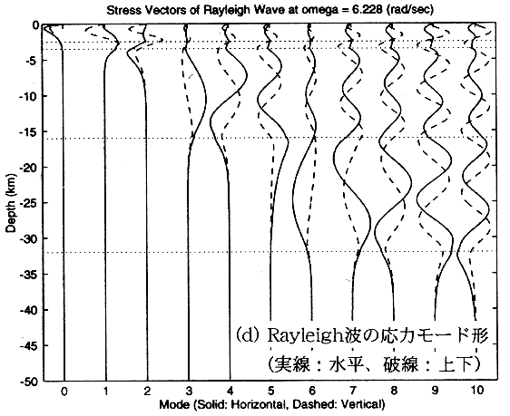 図3:振動数が1HZ時の各次の変位及び応力モード形(図中、水平の破線は層の境界を示す)