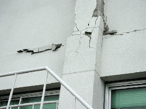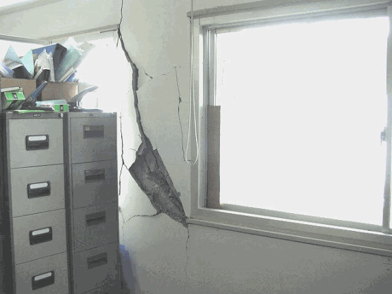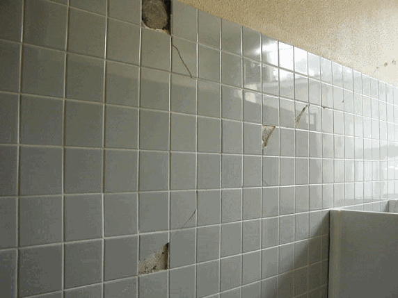写真5 倉橋島役場全景 写真6 トイレ壁面のせん断ひび割れ