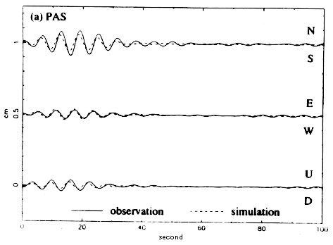 Fig.3 The bandpass displacements (5-8 sec) observed and simulated at (a) PAS and (b) USC, using the 1-D models shown in Fig.4(b).