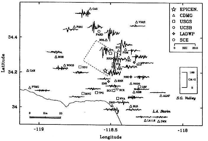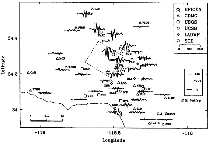 図3:ノースリッジ地震における速度波形と観測位置